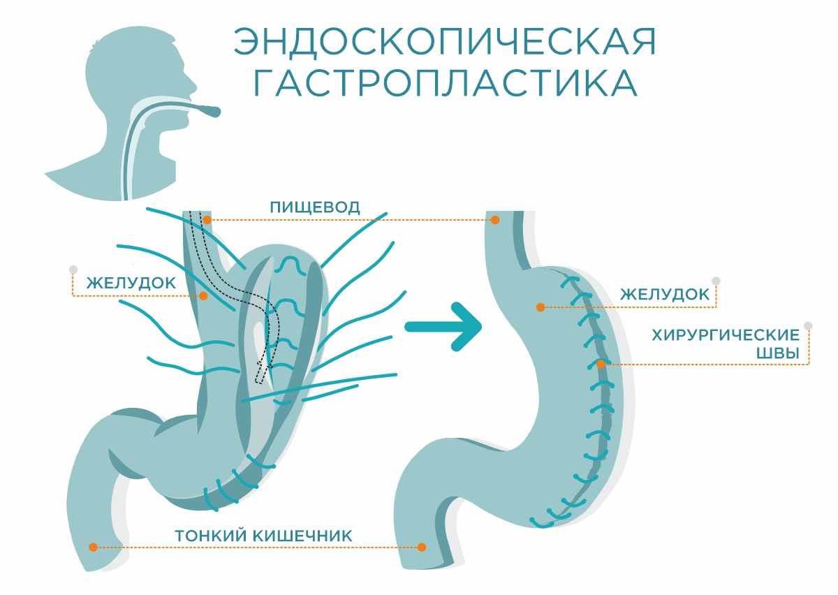 Эндоскопическая рукавная гастропластика – это малоинвазивный вид бариатрической хирургии. Операция подразумевает ушивание желудка изнутри – с помощью эндоскопического оборудования, без разрезов и удаления тканей.